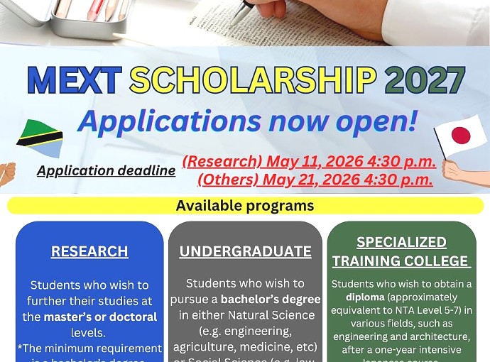 FURSA ZA UFADHILI WA MASOMO NCHINI JAPAN KWA MWAKA 2027(JAPANESE GOVERNMENT – MEXT SCHOLARSHIP PROGRAM 2027)Ubalozi umepokea taarifa ya fursa za ufadhili wa masomo nchini Japan inayotolewa na Serikali ya…