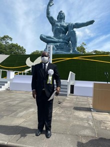 H.E. Ambassador Baraka Luvanda in a photo pose at the Nagasaki Peace memorial Park on 9th August 2022.