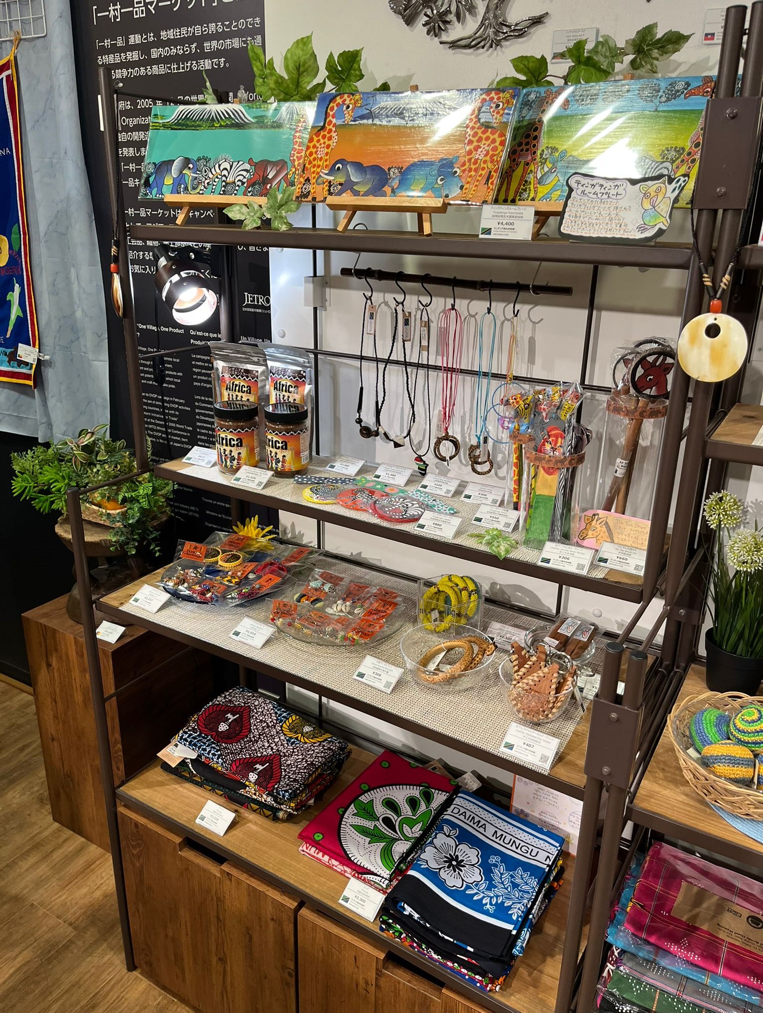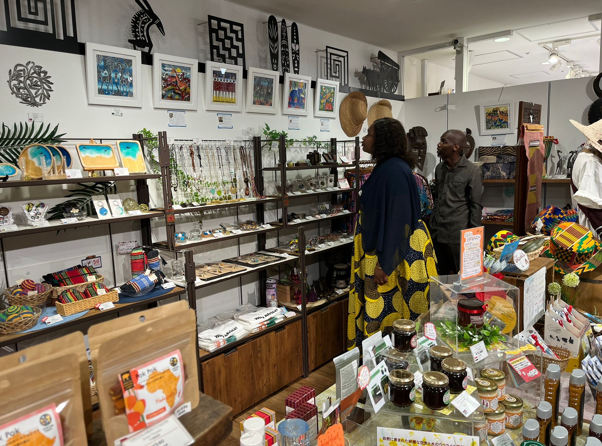 At his tour, H.E. Ambassador Luvanda was delighted to get to see a variety of Tanzanian products, including, Tanzania coffee (Afri - café), Tingatinga paintings, Makonde carvings, kanga and vitenge produced in Tanzania, and cultural accessories designed from kanga and vitenge, to name a few. He promoted for the introduction of other Tanzania products like cashew nuts and honey, which he believed the Japanese would adore them.