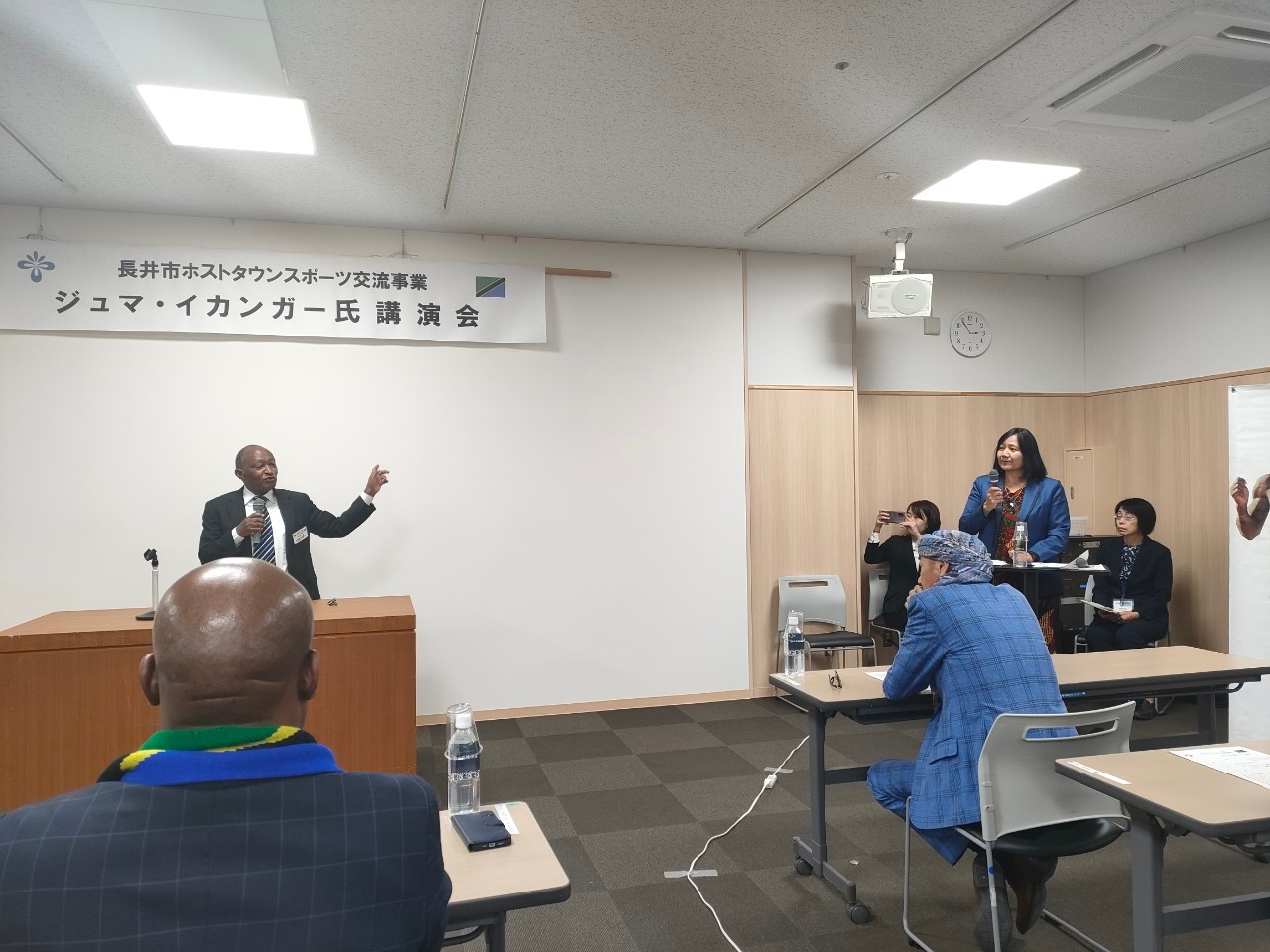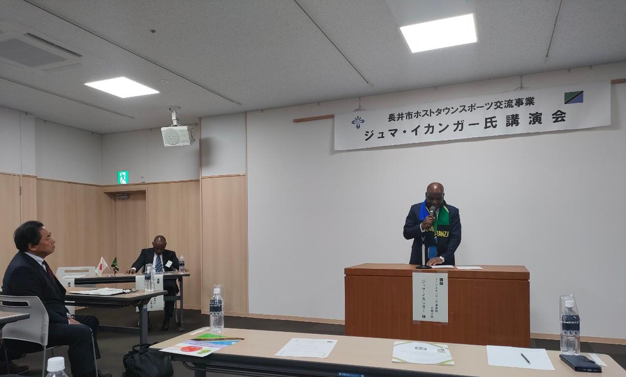 Kanali Mstaafu, Juma Ikangaa, Kiongozi wa Ujumbe wa Tanzania akitoa historia yake ya uanariadha, wakati wa Hafla ya Kuwakaribisha Wanariadha wa Tanzania kwenye Mashindano ya Nagai Marathon 2023, iliyofanyika tarehe 14 Oktoba 2023, jijini Nagai