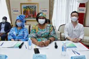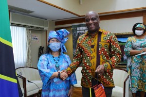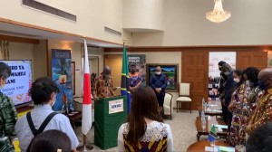 Balozi Luvanda akiwa na Bi. Midori Uno, Bw. Yoshiharu Matsumoto na Bi. Kuniko Shimizu, wadhamini wa Shindano la Kuwasilisha Mada kwa Lugha ya Kiswahili