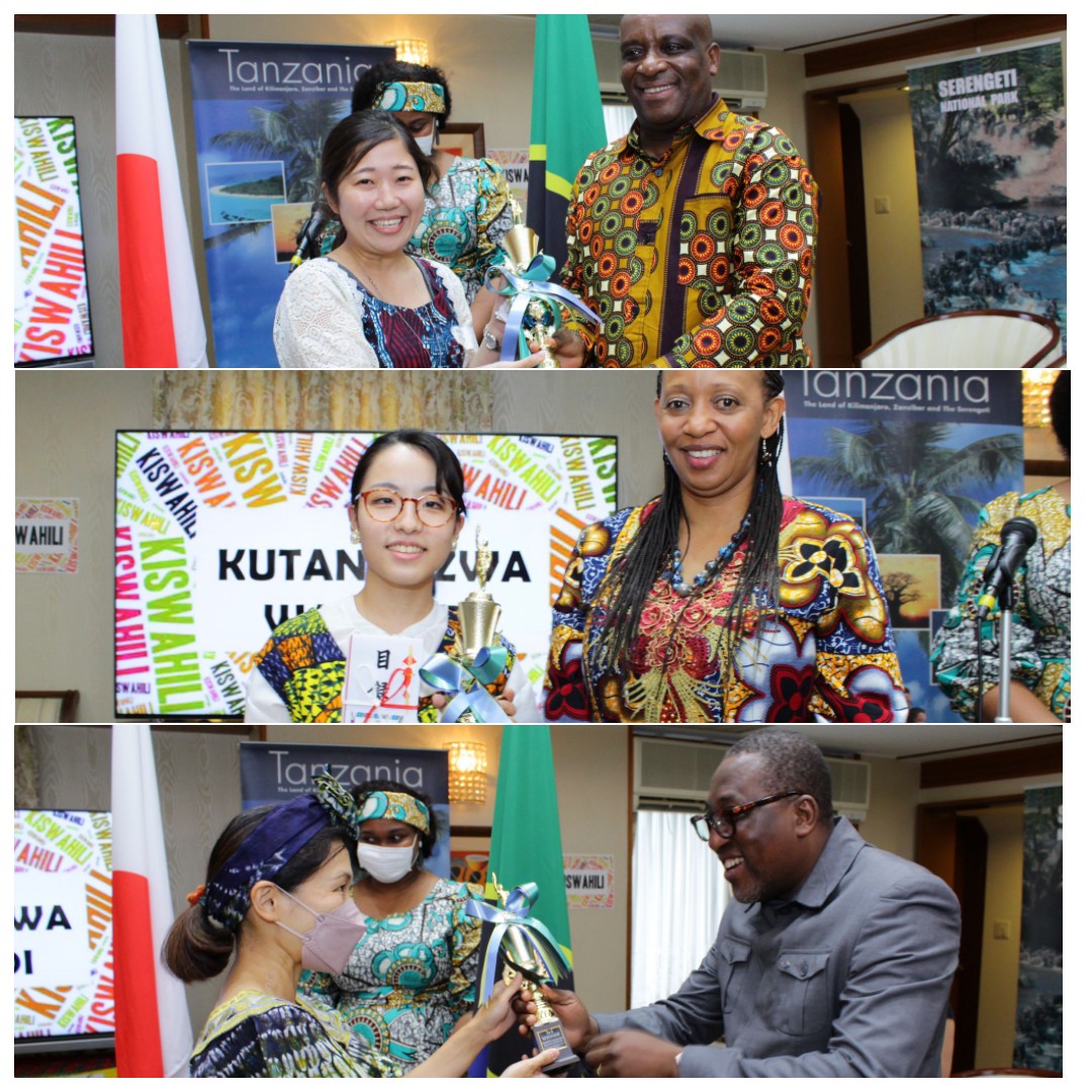 Pamoja na kuwatangaza na kuwapatia zawadi washindi watatu (3) wa shindano hilo, ubalozi ulitoa zawadi nyingine ndogo ndogo kwa washiriki wengine wote ikiwa ni katika kuwa hamasisha zaidi kushiriki katika mashindano hayo wakati mwingine. Mshindi wa kwanza wa Shindano hilo alikuwa Bi. Masami Sumi aliyewasilisha mada inayohusu “Utamaduni wa Kiswahili unaunganisha Watu”; nafasi ya pili ilichukuliwa na Bi. Megumi Yama, mwanafunzi wa Chuo Kikuu cha OSAKA, miongoni mwa vyuo vikuu vinavyofundisha Lugha ya Kiswahili nchini Japan, mada yake ilihusu "Kanga: Vazi linalovutia katika Utamaduni wa Kiswahili"; na nafasi ya tatu ilienda kwa Bi. Yasuko Togashi, ambaye aliwasilisha mada inayohusu “Nimechoka Kidogo - Watoto wa Kiswahili wana Upendo na Urafiki wakanisaidia”.