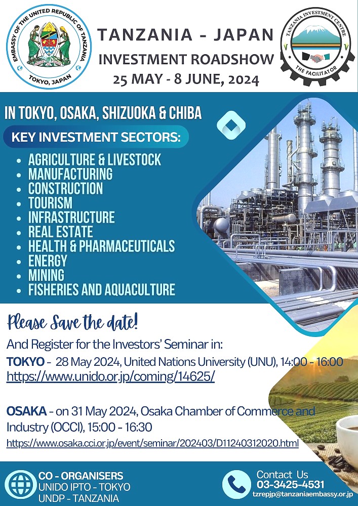The Embassy, in collaboration with Tanzania Investment Center (TIC), UNIDO IPTO - Tokyo, and UNDP Tanzania, presents the Tanzania Investment Road Show in Japan from 25th May to 8th June 2024.