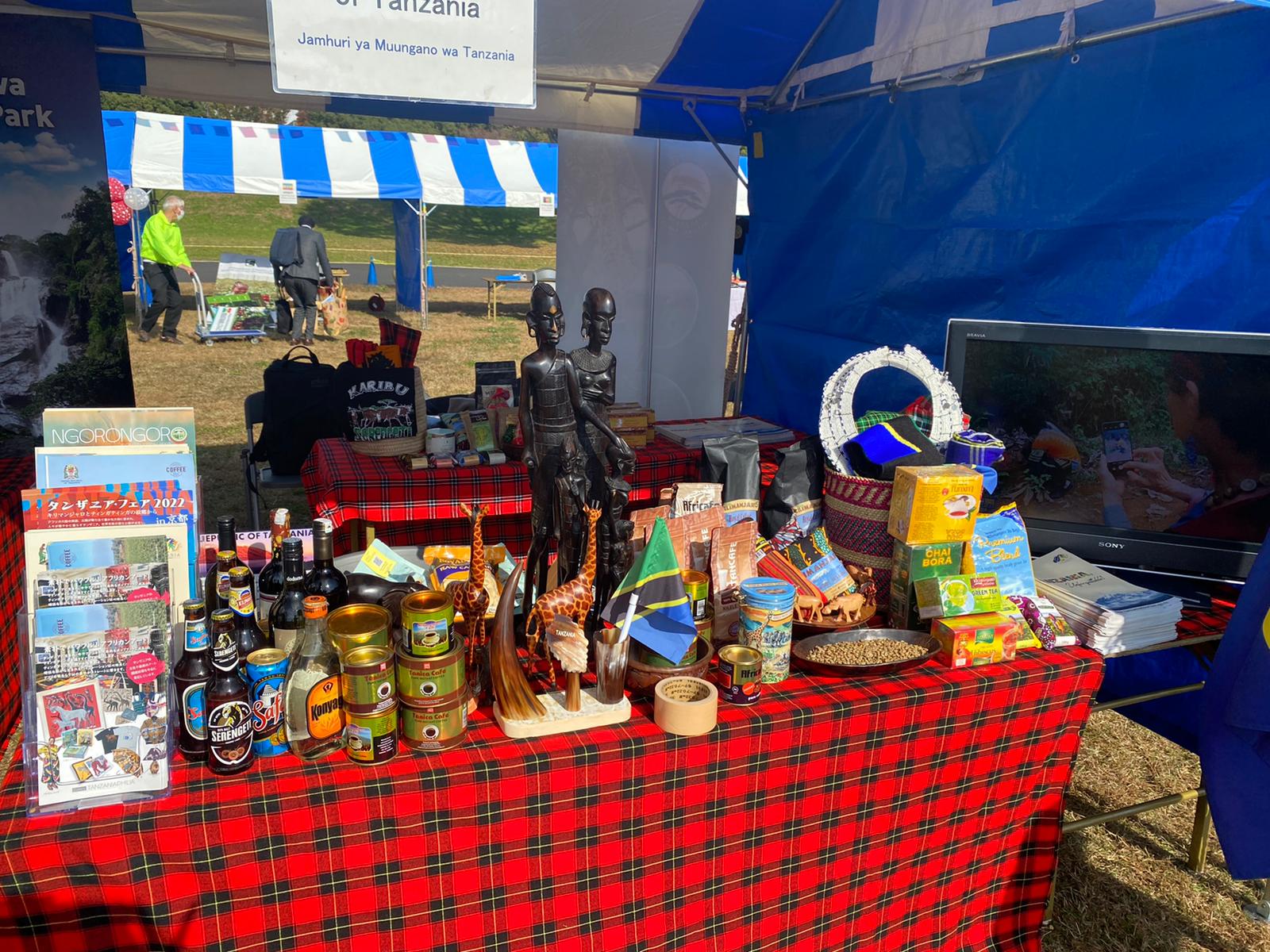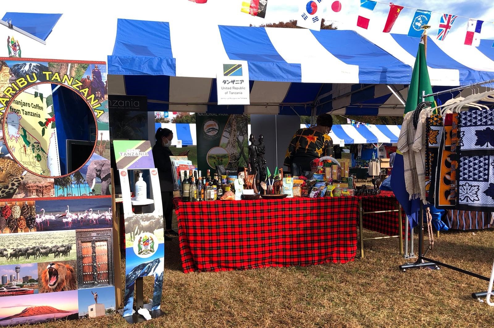 The Embassy promoted Tanzania agricultural and manufactured products such as cashew nuts, coffee, tea, wines, beers, and spirits at the festival; displayed Tanzanian's arts and crafts like "Makonde" carvings, "Tingatinga" paintings, and tourism attraction pictures; wrapped traditional clothing such as "Masai shuka" and "kanga"; and played promotional videos including the Tanzania - Royal Tour documentary.