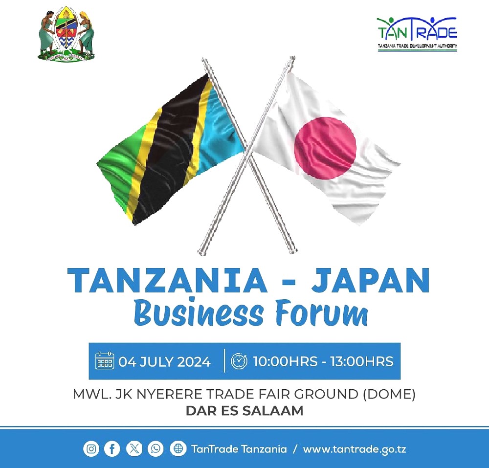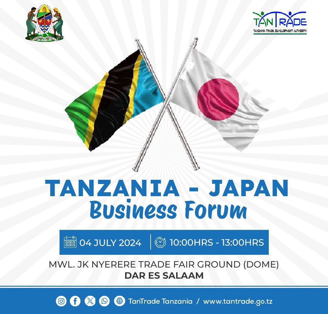 The Tanzania Trade Development Authority (TanTrade) in collaboration with the Embassy of Japan in Tanzania and JICA is organizing a Tanzania and Japan Business Forum to be held at Mwl. J.K Nyerere Fair Ground (Saba Saba) on Thursday, July 4th, 2024, starting at 10:00 AM. The forum will include B2B sessions covering various sectors, including Coffee, Sesame, Raw Tobacco, Metal Scraps, Precious Metals, and Minerals.