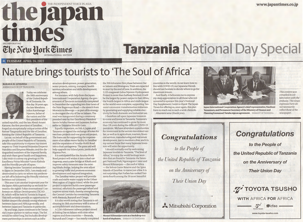 Special Day of the United Republic of Tanzania published on 26th April 2022 in the Japan Times, the major international newspaper in Japan, for the 58th Anniversary of the Union. The full article is available through the following link: