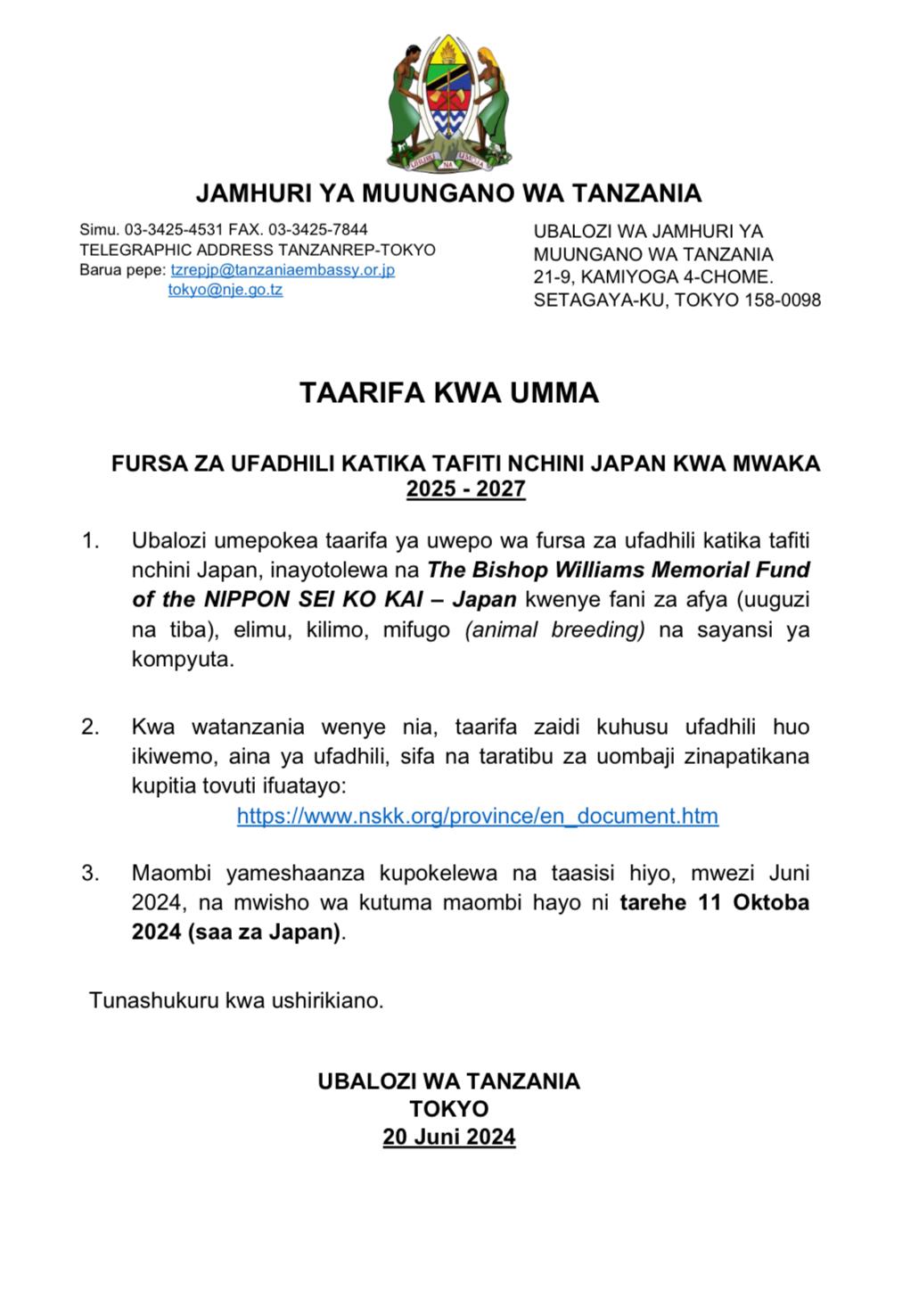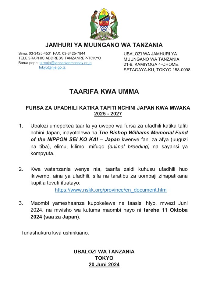 To all Tanzanians interested in the Bishop Williams Memorial Fund - Visiting Researcher Program Scholarship support, please open the following link for full information