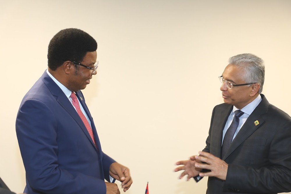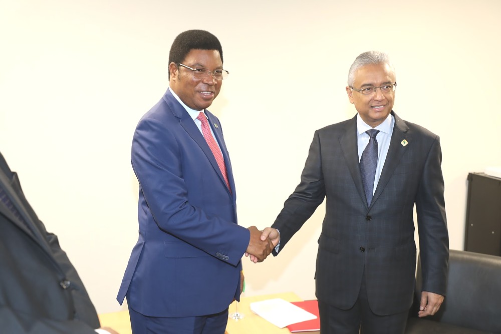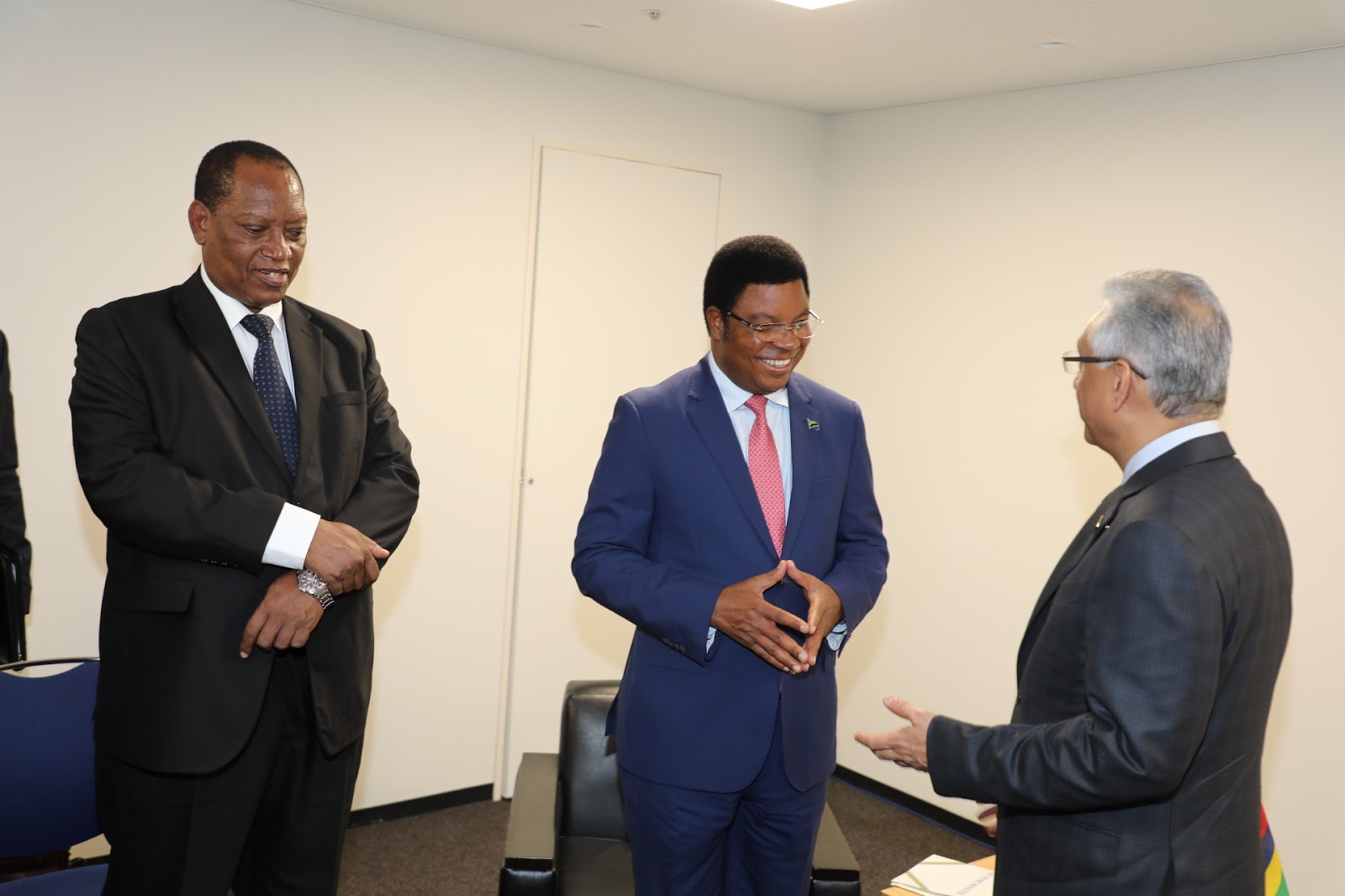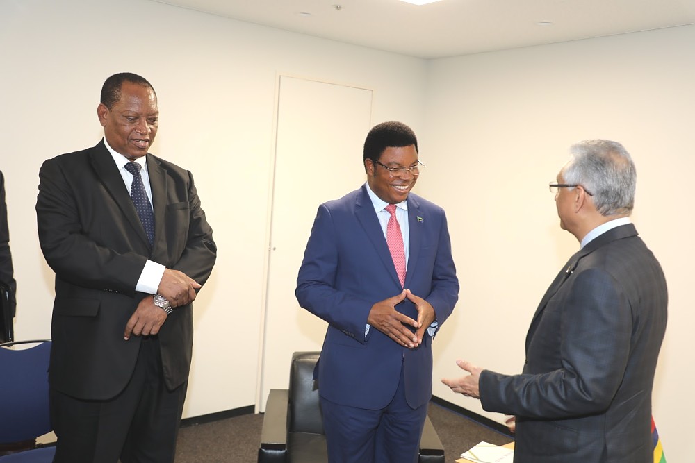 Waziri Mkuu wa Tanzania Mhe. Kassim Majaliwa (Mb) akiwa na Waziri Mkuu wa Mauritius Mhe Pravind Jugnauth walipokutana na kufanya mazungumzo katika mji wa Yokohoma Japan. Kushoto kwa Mhe. Majaliwa ni Waziri wa Mambo ya Nje na Ushirikiano wa Afrika Mashariki Prof Palamagamba John Kabudi (Mb).