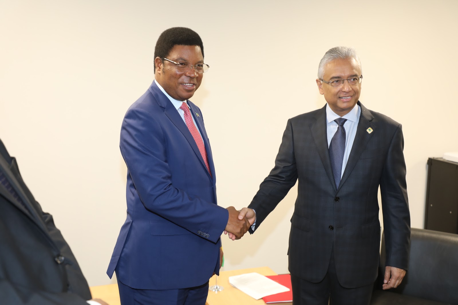 Waziri Mkuu wa Tanzania Mhe. Kassim Majaliwa (Mb) akisaliqmiana na Waziri Mkuu wa Mauritius Mhe Pravind Jugnauth walipokutana na kufanya mazungumzo katika Mji wa Yokohoma Japan.