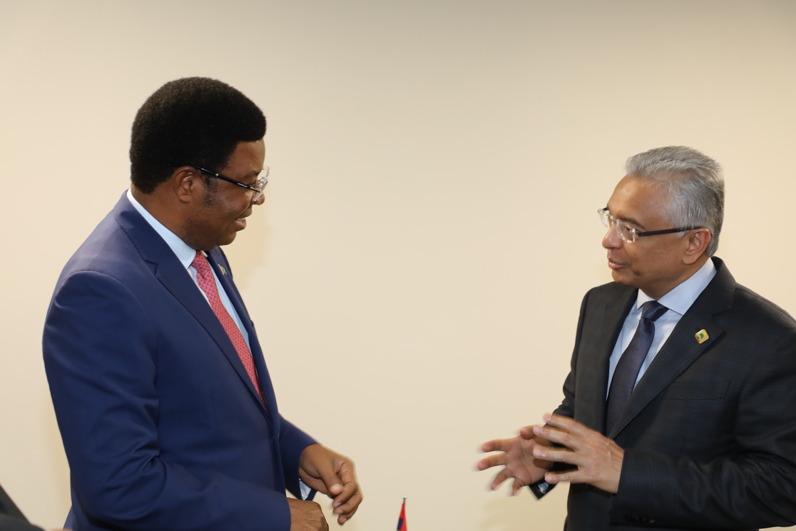 Waziri Mkuu wa Tanzania Mhe. Kassim Majaliwa (Mb) akisikiliza jambo kutoka kwa Waziri Mkuu wa Mauritius Mhe Pravind Jugnauth. Viongozi wote wawili walikutana na kufanya mazungumzo ya namna ya kuimarisha uhusiano wa kibiashara na kidiplomasia baina ya Nchi hizo. wote wapo katika Mji wa Yokohoma,Japan kushiriki mkutano wa TICAD7.