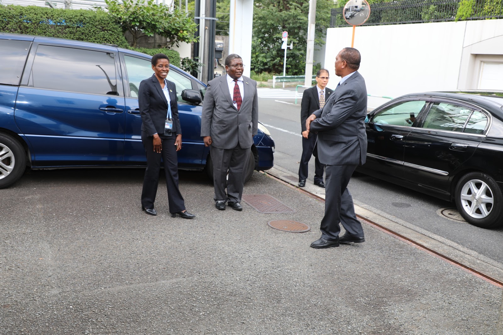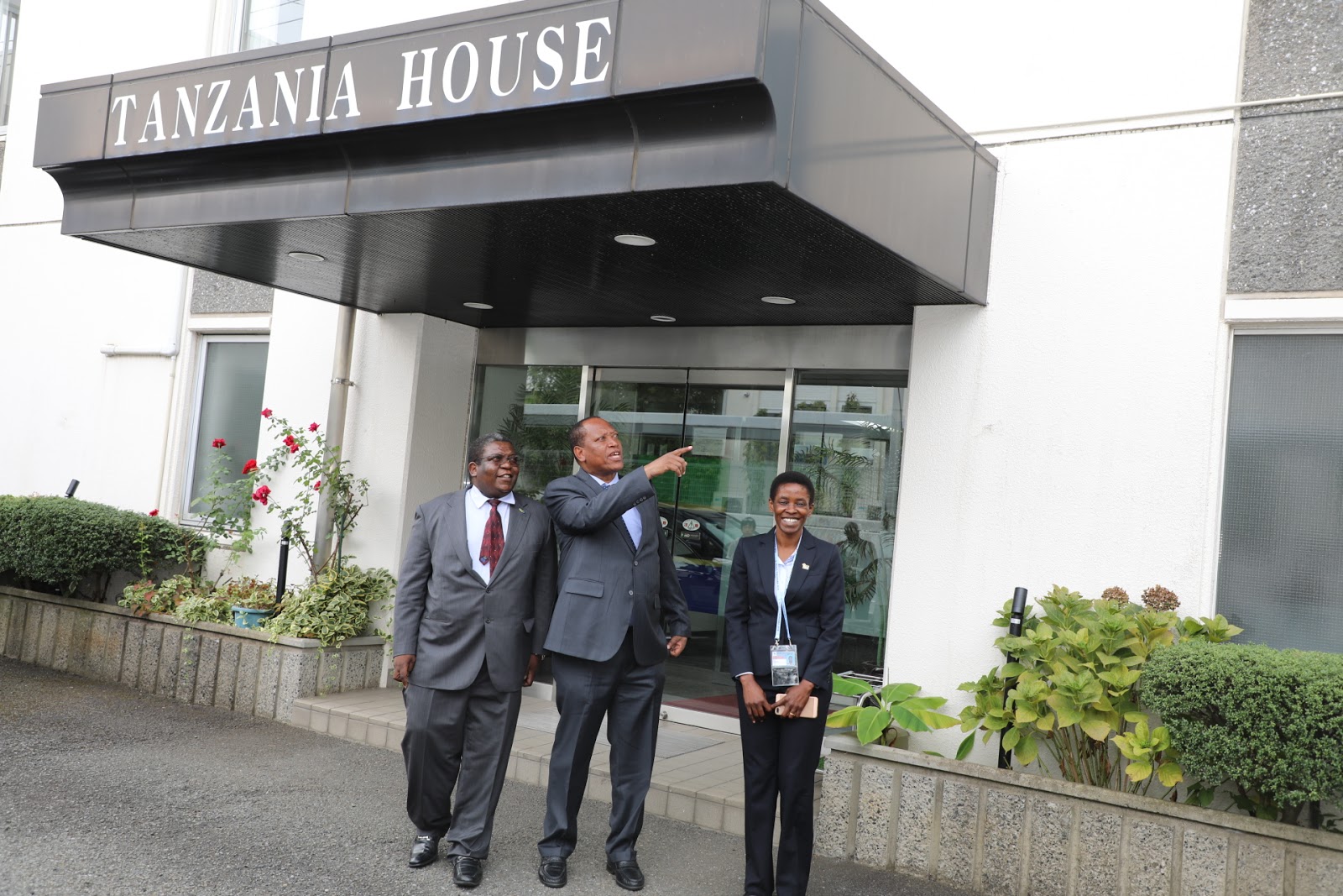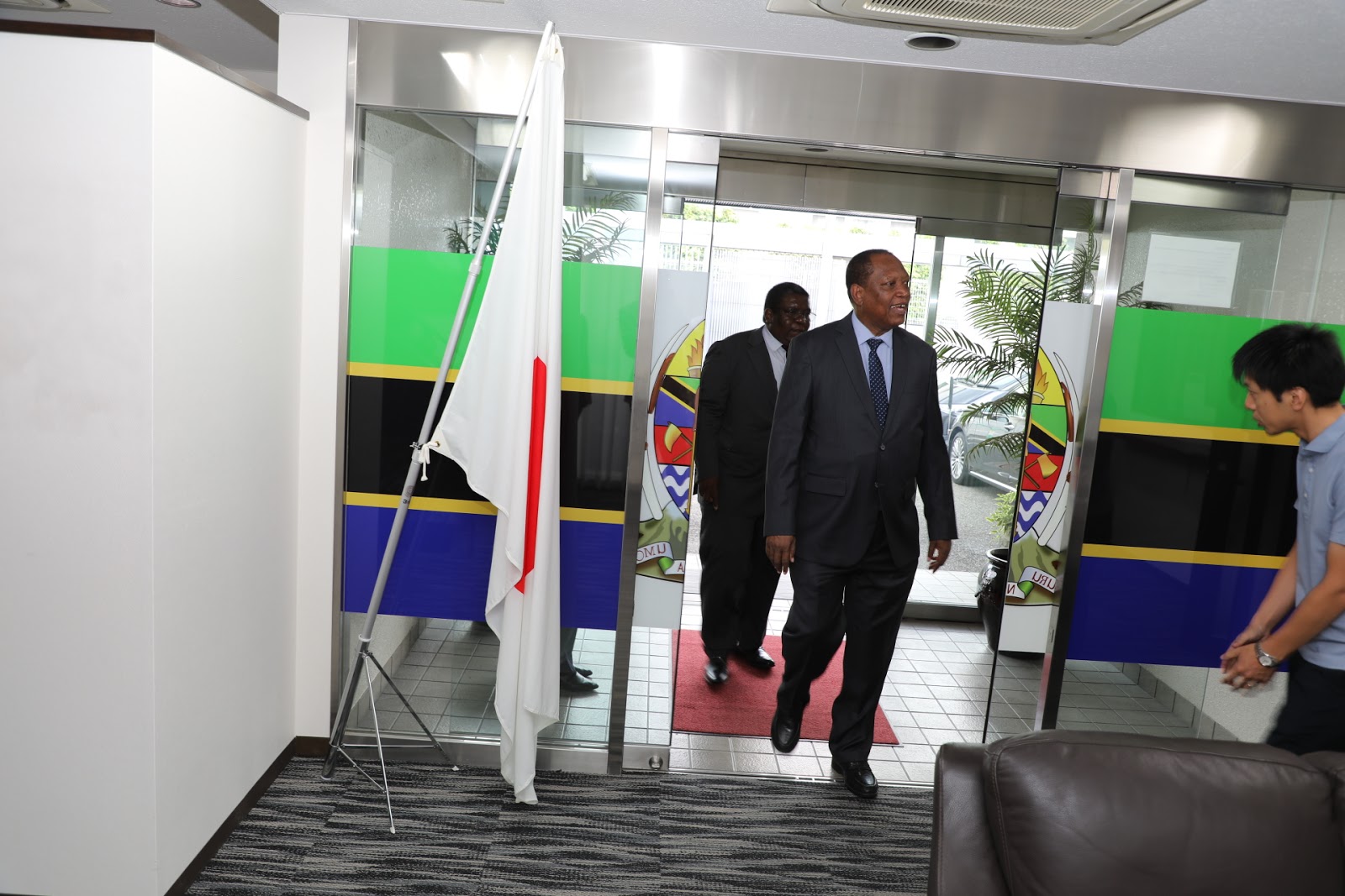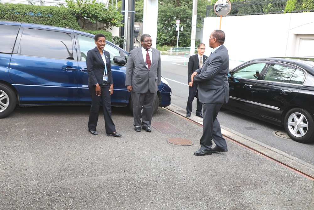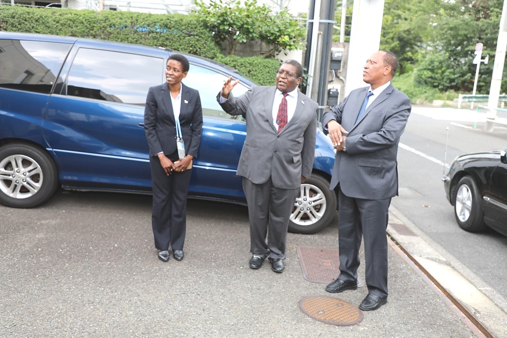 Waziri wa Mambo ya Nje na Ushirikiano wa Afrika Mashariki Prof. Palamagamba John Kabudi (Mb) akiwasili katika Ubalozi wa Tanzania uliopo Tokyo,Japan. Katikati ni Kaimu Balozi wa Tanzania Nchini Japan Bw. John Kambona akifuatiwa na Bi. Edda Magembe Afisa Ubalozi. August 26,2019.