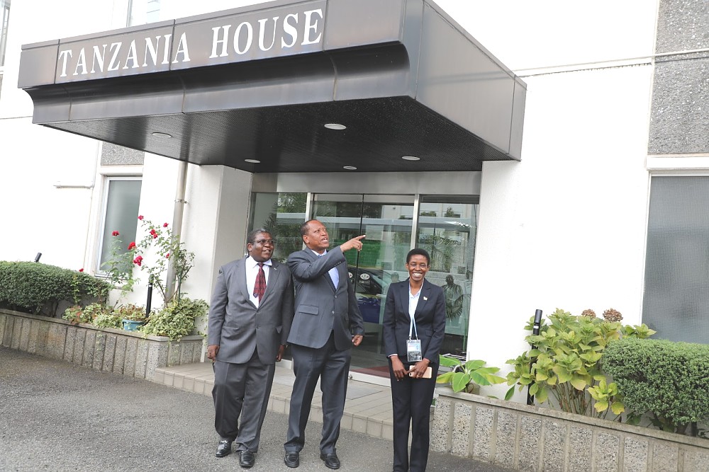 Kaimu Balozi wa Tanzania Nchini Japan Bw. John Kambona (katikati) akitoa ufafanuzi wa jambo kwa Waziri wa Mambo ya Nje na Ushirikiano wa Afrika Mashariki Prof. Palamagamba John Kabudi (Mb) mara baada ya kuwasili katika Ubalozi wa Tanzania uliopo Tokyo,Japna anayefuatia ni Bi. Edda Magembe Afisa Ubalozi. August 26,2019.
