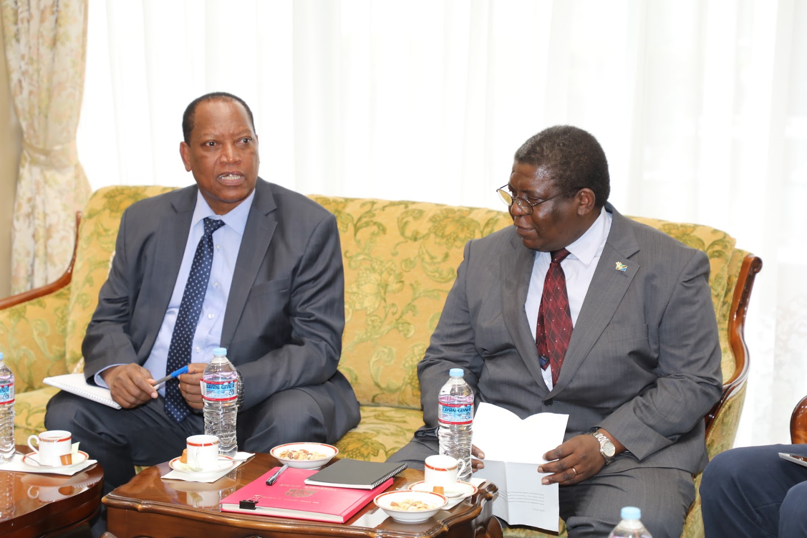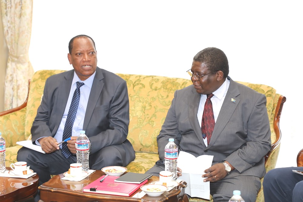 Waziri wa Mambo ya Nje na Ushirikiano wa Afrika Mashariki Prof. Palamagamba John Kabudi (Mb) akitoa maelekezo kwa Kaimu Balozi wa Tanzania Tokyo,Japan Bw. John Kambona akiwa na Afisa Ubalozi Bi. Edda Magembe. August 26,2019.